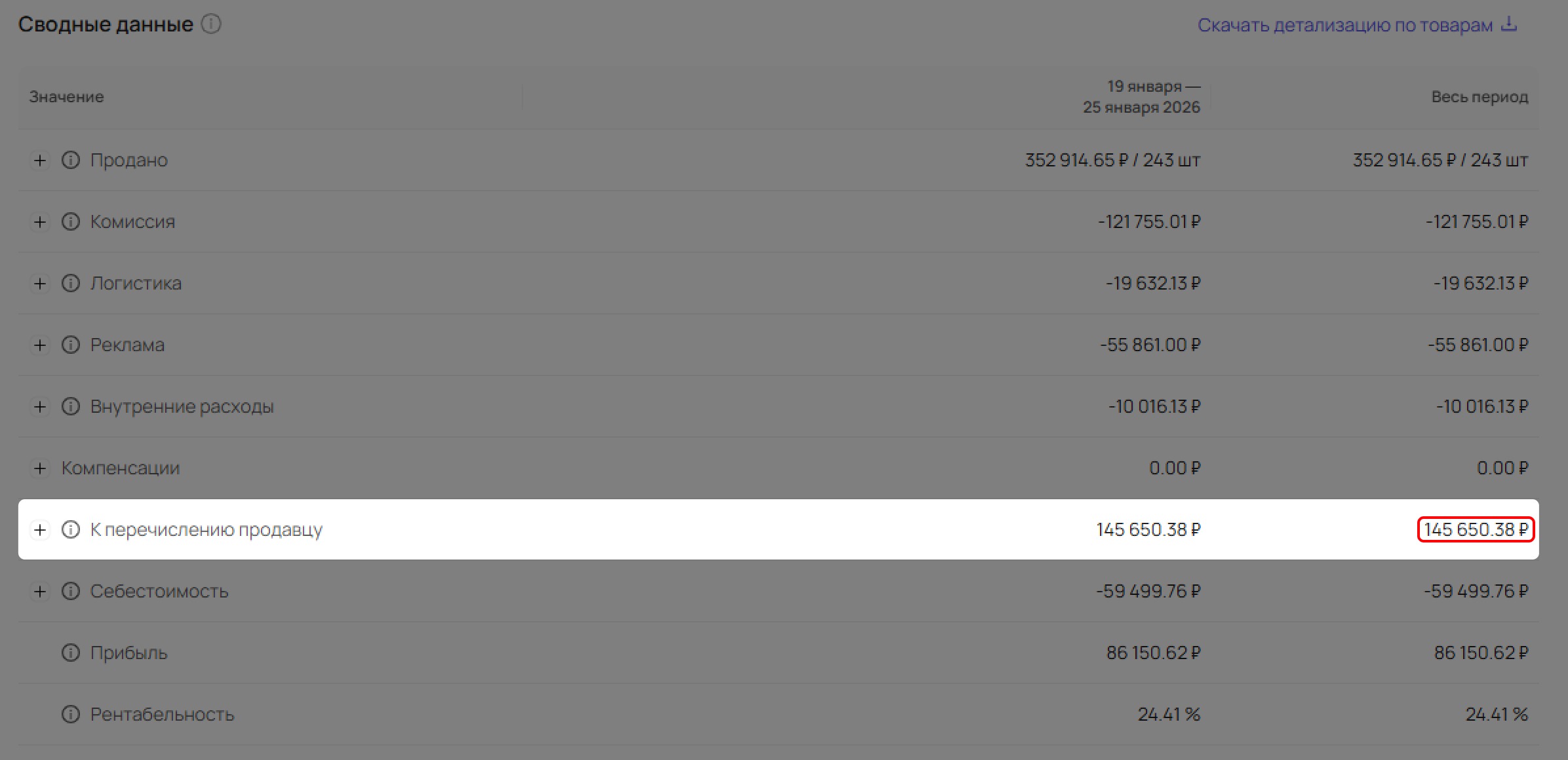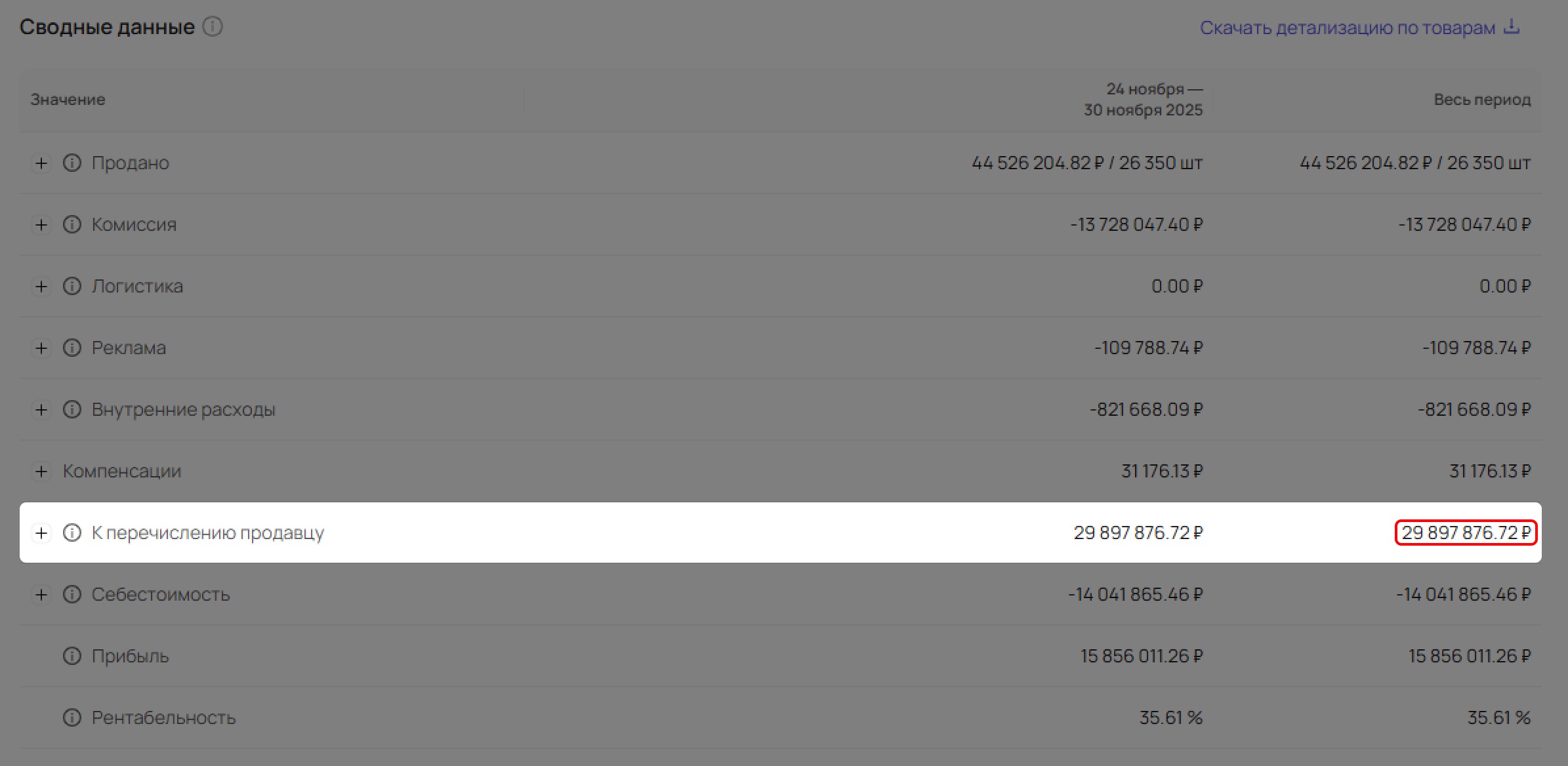 Строка «К перечислению продавцу» показывает ваш чистый заработок от продаж до того, как WB забрал часть денег в счёт погашения займа. Именно поэтому при сверке вам нужно взять финальную выплату от Wildberries («Итого к оплате») и прибавить к ней сумму удержаний на заём («Перевод на баланс заёмщика»). Итоговая цифра должна совпасть с данными LiteStat.