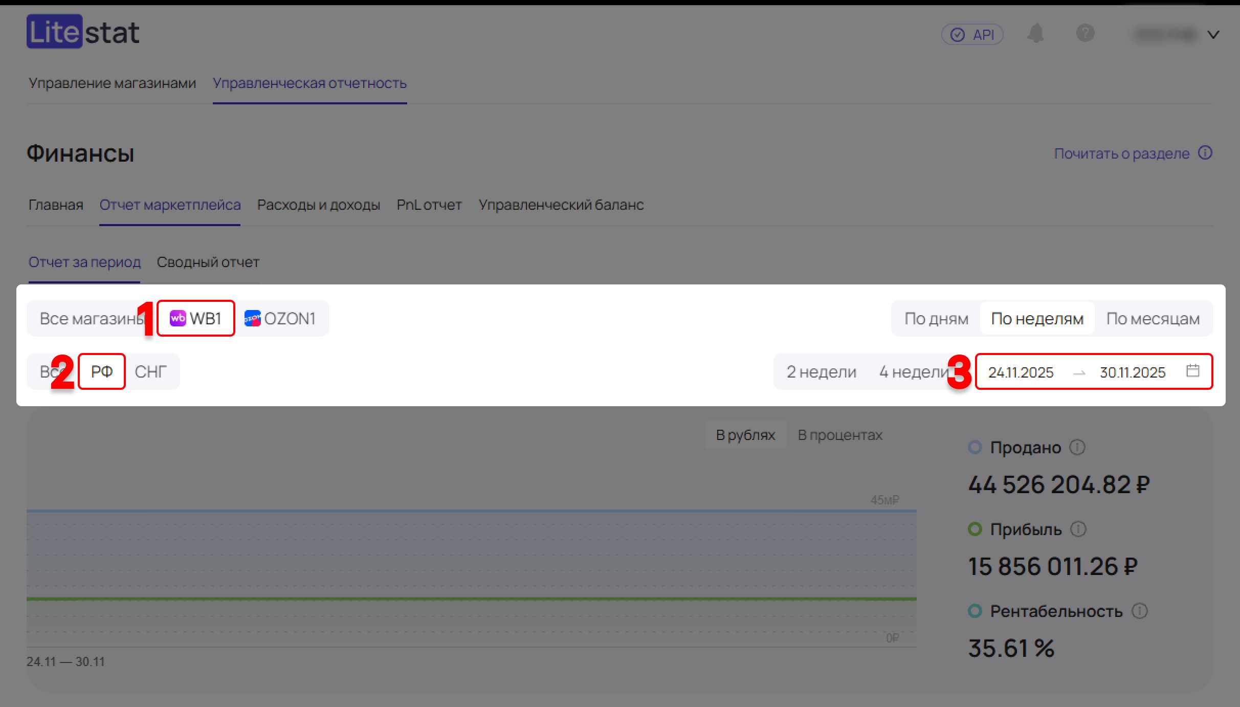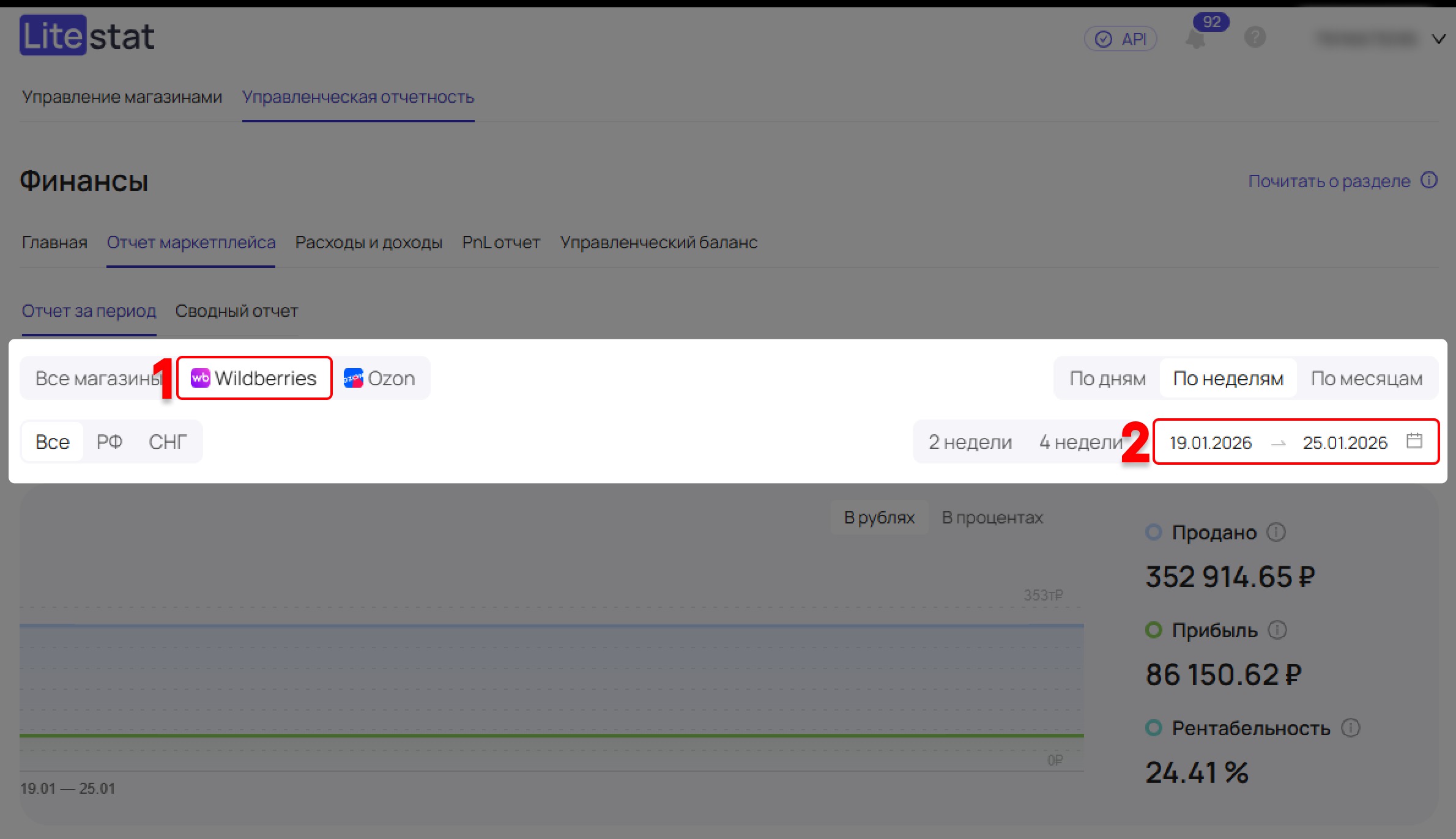 Wildberries формирует финансовые отчёты по неделям (с понедельника по воскресенье), а в LiteStat вы можете выбрать любой период. Поэтому если вы хотите сверить данные с WB, даты в LiteStat должны совпадать с датами еженедельных отчётов маркетплейса.