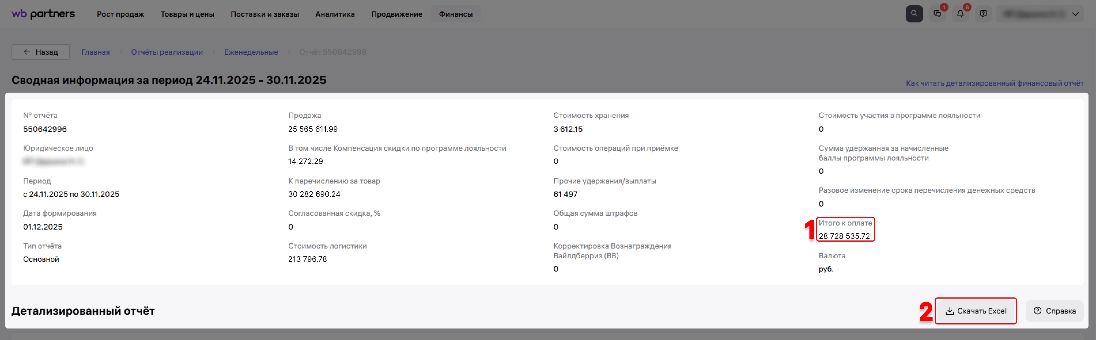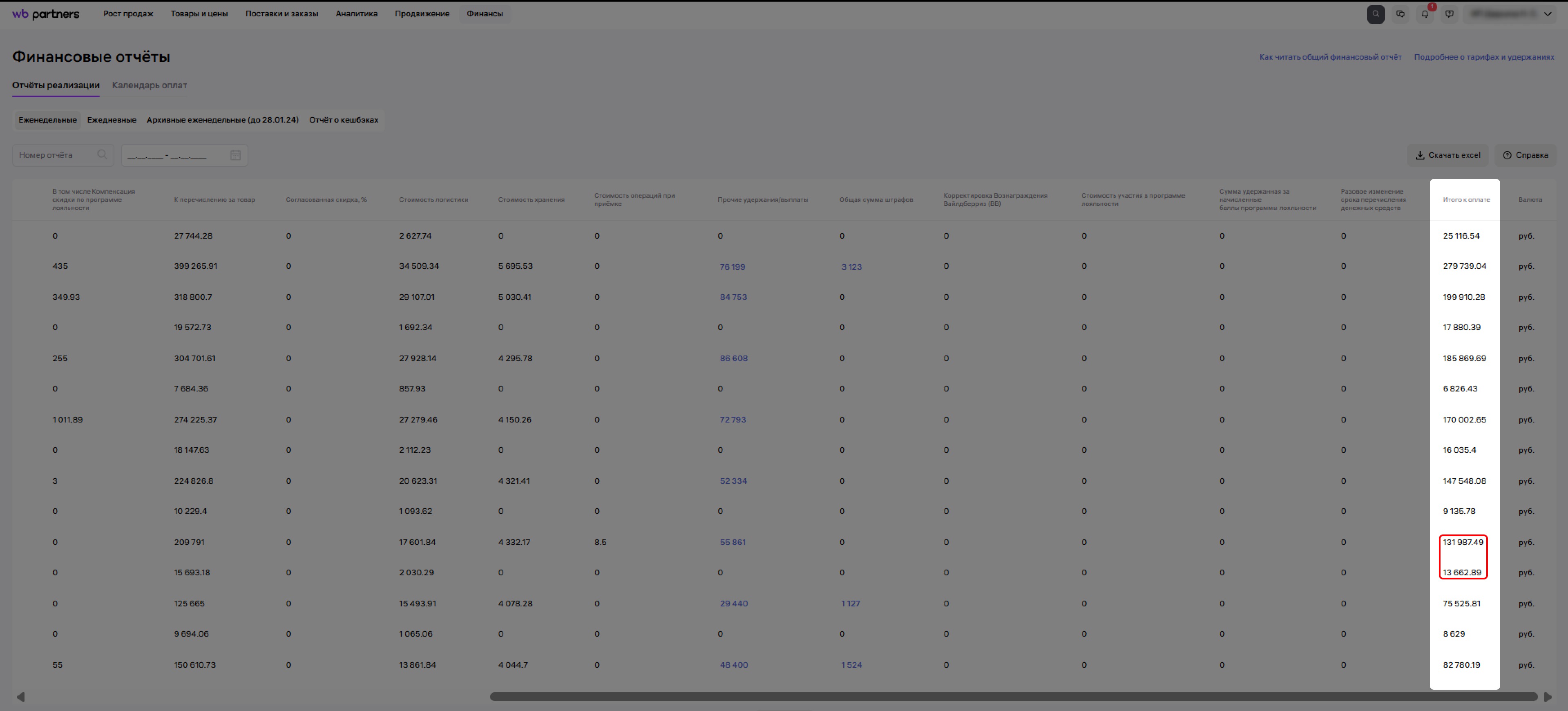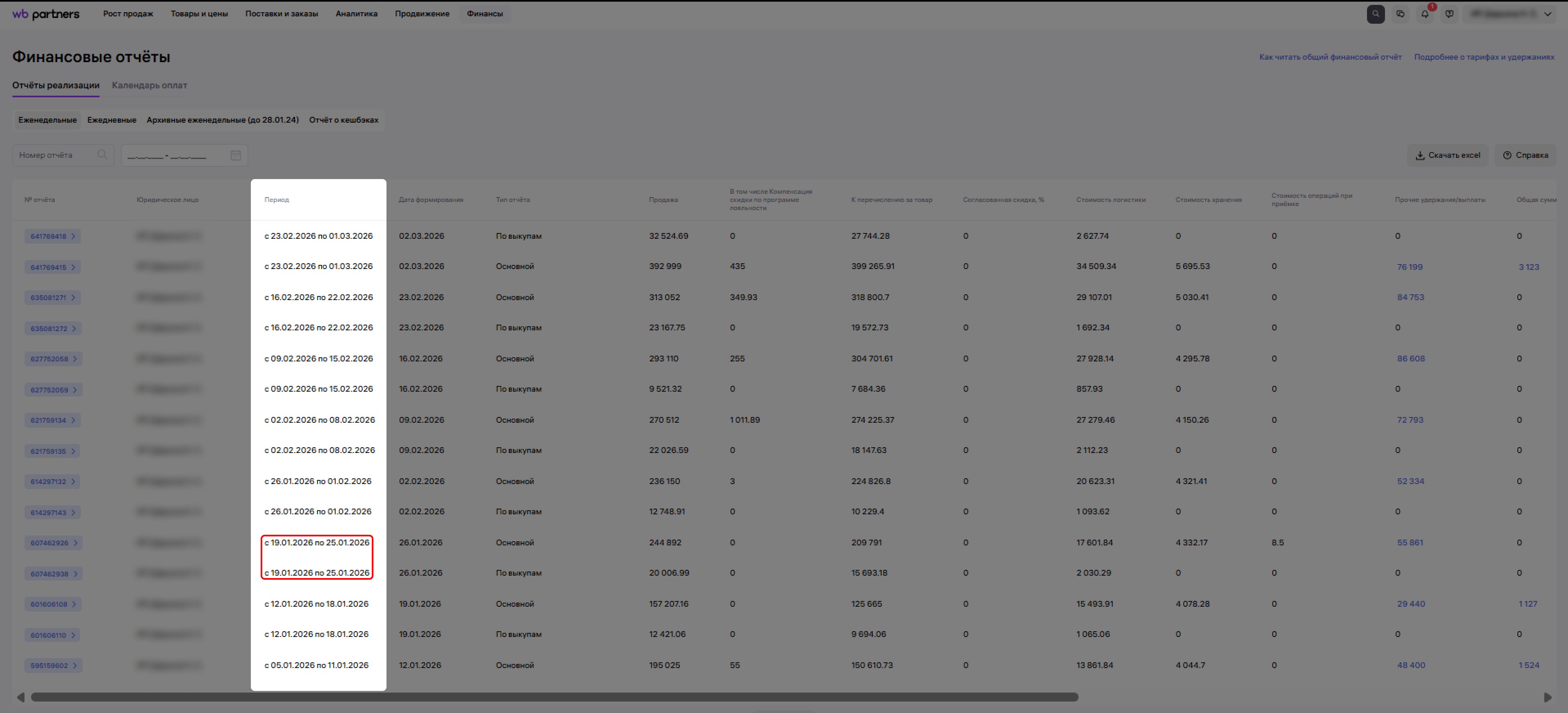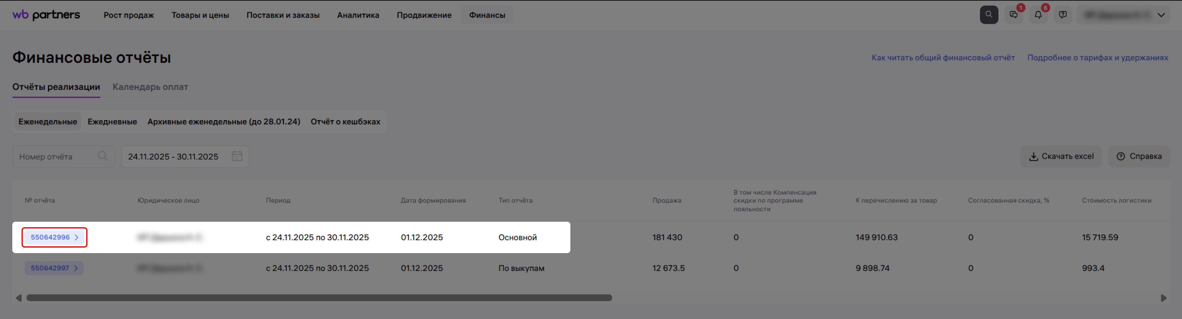 • Перейдите в раздел «Финансы» → «Финансовые отчёты» → «Отчёты реализации» → «Еженедельные». • Найдите отчёты за нужный период (обычно две строки за отчётную неделю).
