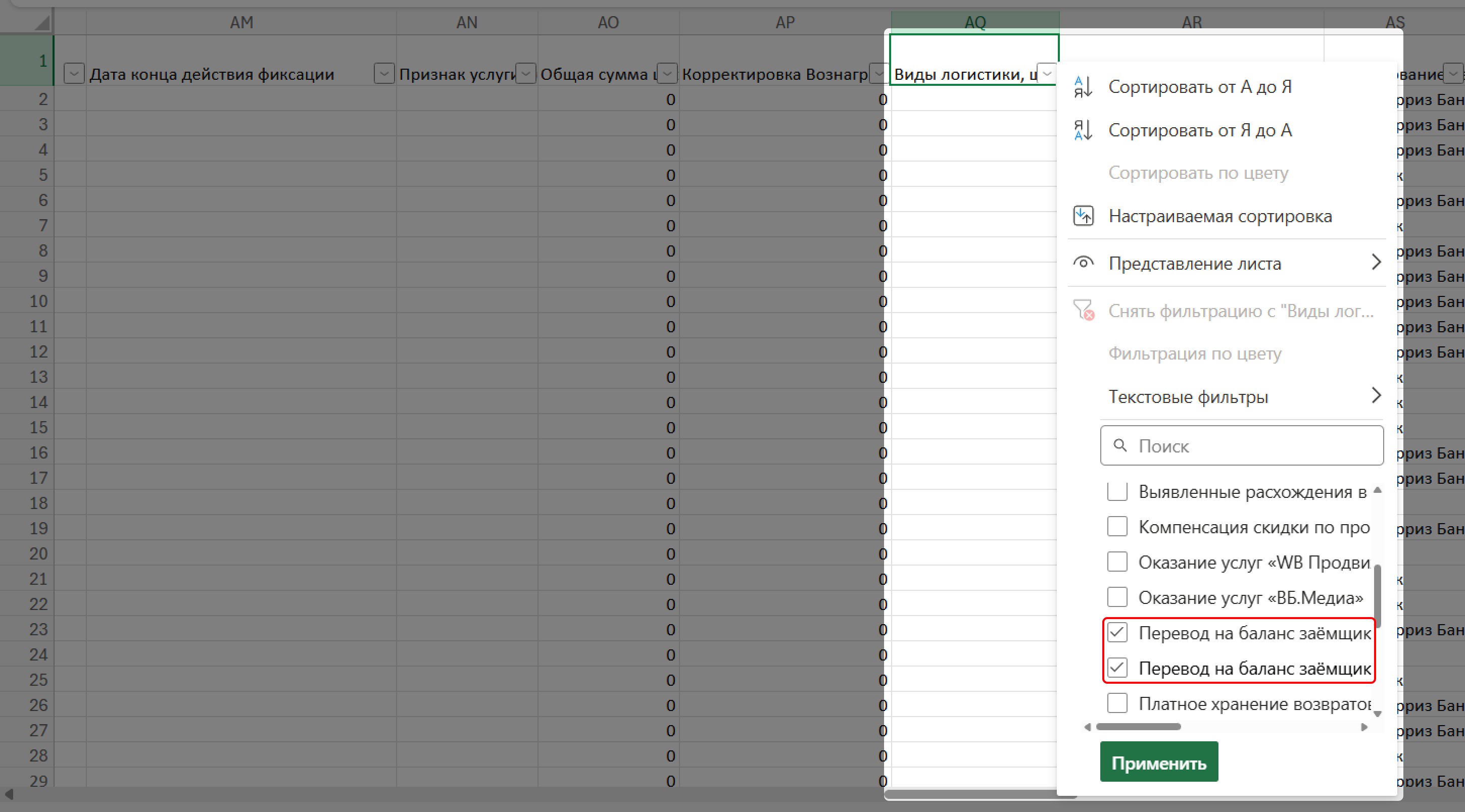 • Найдите столбец «Виды логистики, штрафов и корректировок ВВ» и выберите фильтры по оплате займов.