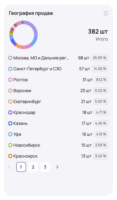 Блок «География продаж» показывает, в какие регионы отправлялись заказы по выбранному товару за период.