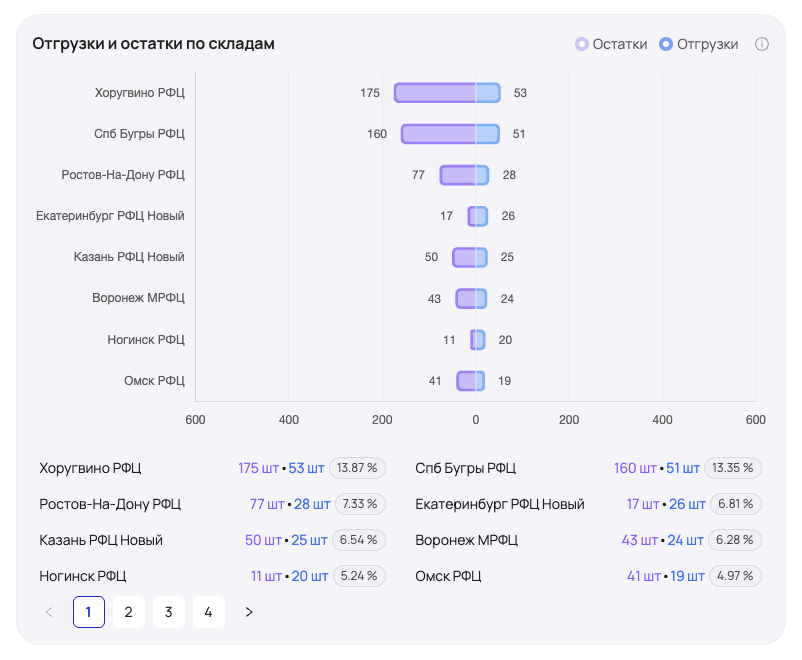 «Отгрузки» отображают, с каких складов и в каком объёме отправлялись заказы, а также долю каждого склада в общем объёме отгрузок.
