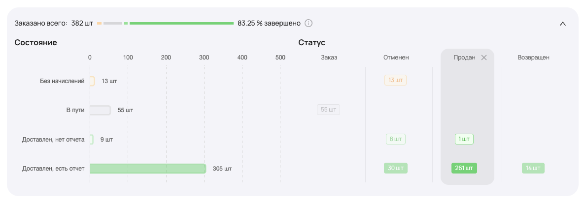 Виджет «Состояние» показывает, что происходит с заказами по товару и насколько полна информация для расчёта финансов.