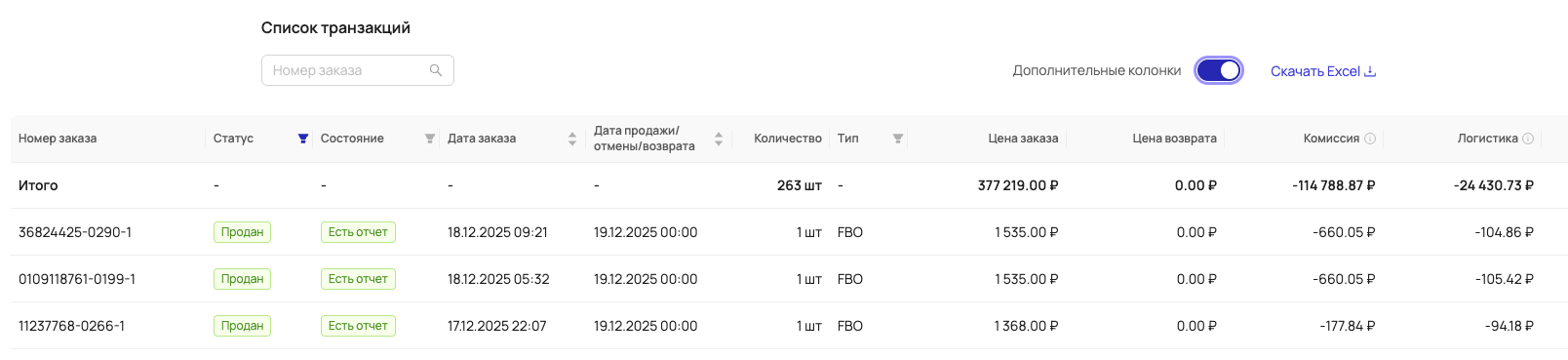 Финансовый анализ. На уровне отдельных заказов видеть выручку, возвраты, комиссии, логистику и другие расходы, чтобы оценивать прибыльность товара.