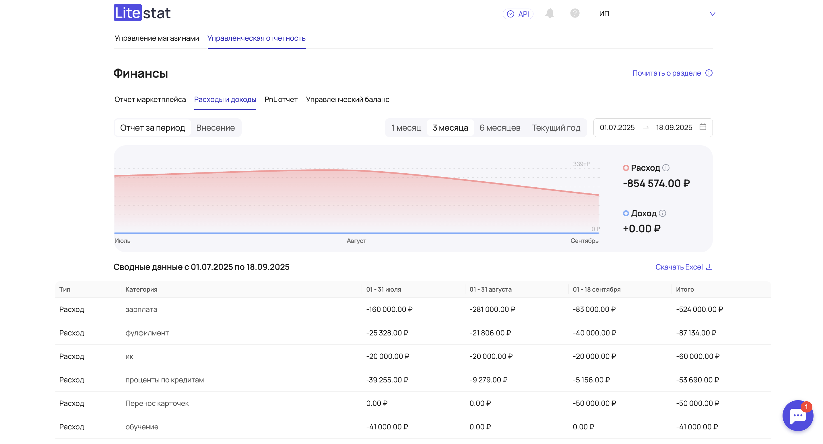 Эти статьи LiteStat забирает из отчётов МП и показывает в блоке «Внутренние расходы и доходы».