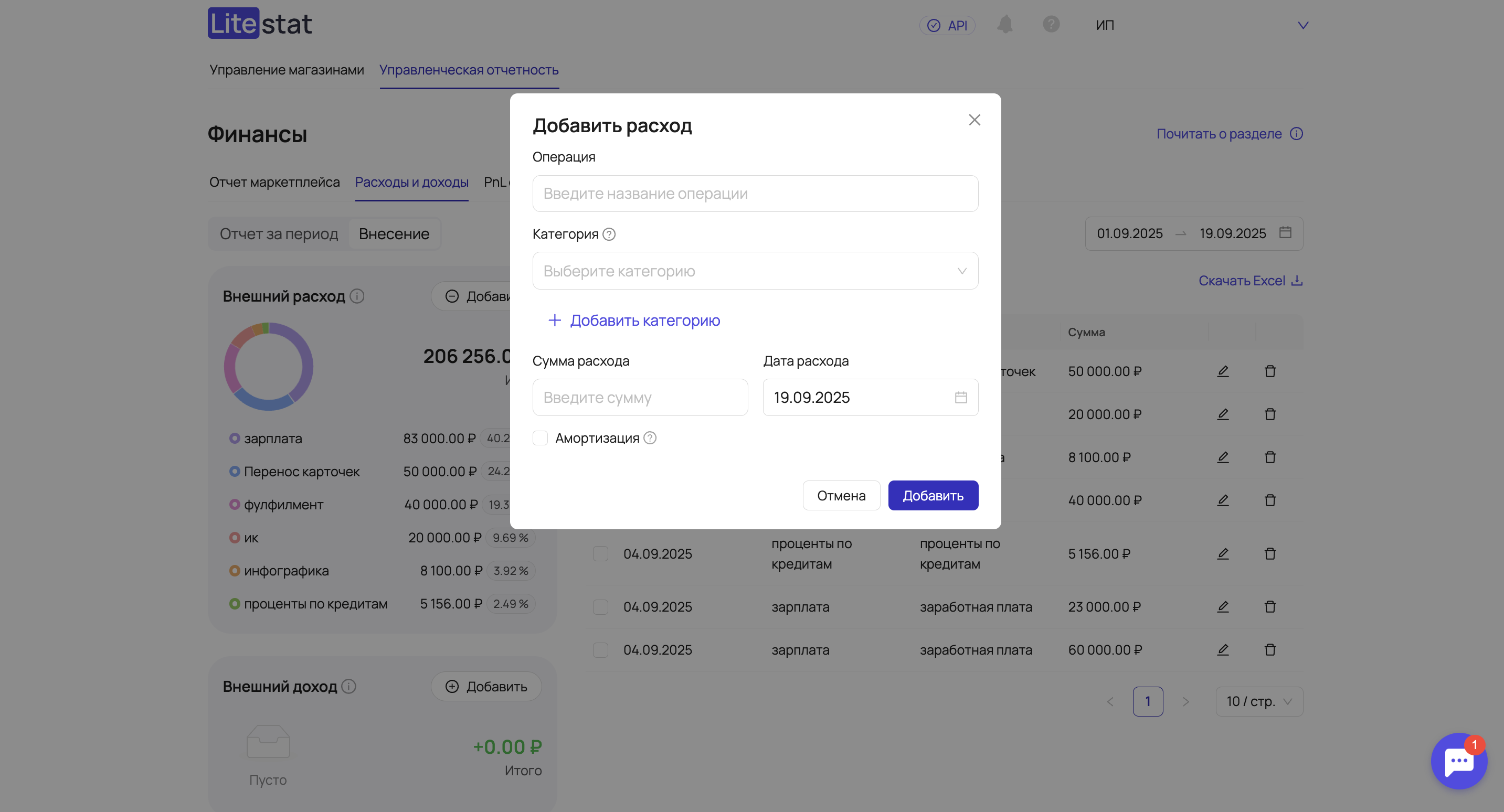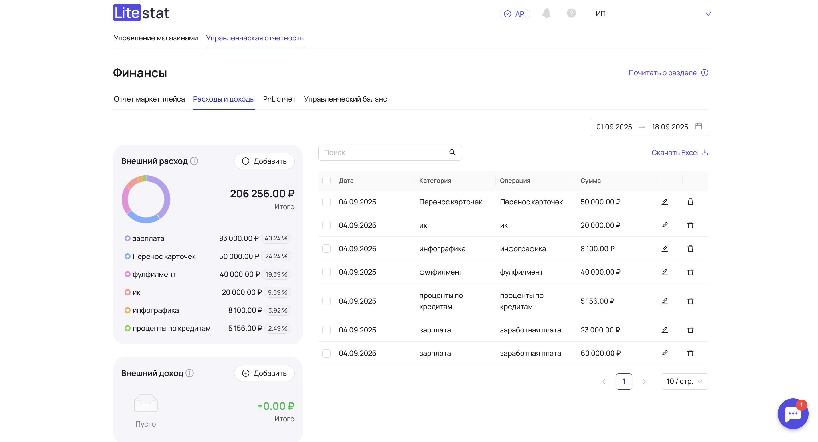 Раздел «Расходы и доходы» в LiteStat предназначен для учета всех внешних финансовых операций, которые не связаны напрямую с продажами на маркетплейсах. Эти операции автоматически попадают в PnL-отчёт и влияют на прибыль по бизнесу в целом.