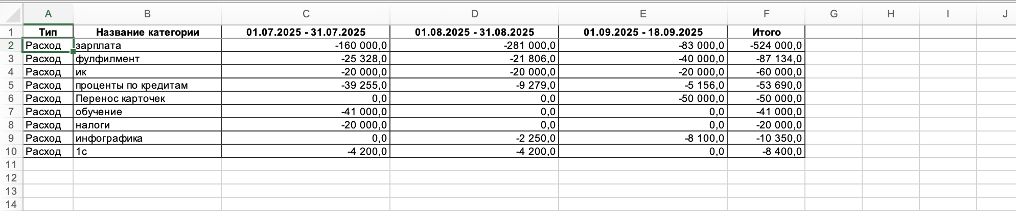 Экспорт в Excel — получите удобную сводную таблицу с колонками по месяцам и строками категорий.