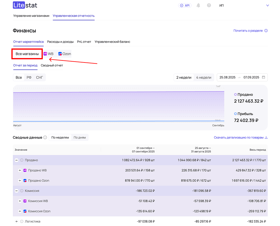 Теперь в разделе «Управленческая отчётность» → «Отчёт маркетплейса» появилась вкладка «Все магазины», которая значительно упрощает анализ.