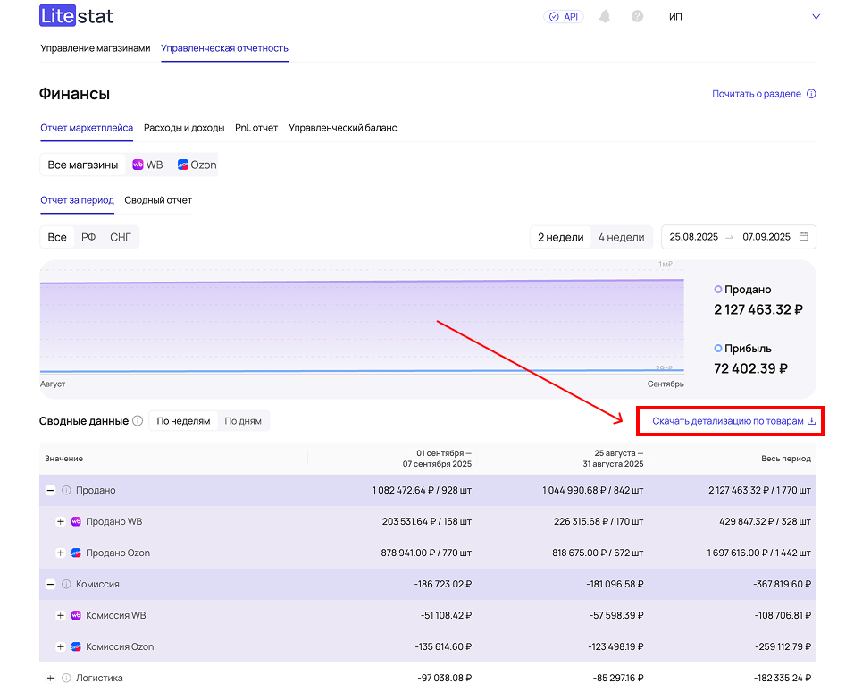 Например, если у вас 2 магазина: один на WB, а другой на Ozon — вы можете посмотреть общую прибыль, оборот и сравнить выкупаемость по всем магазинам за август.
