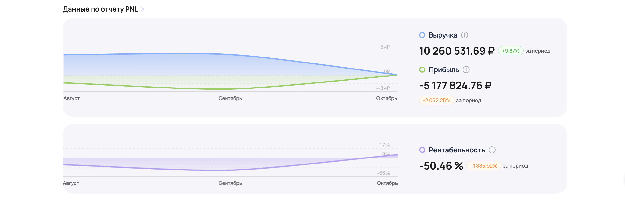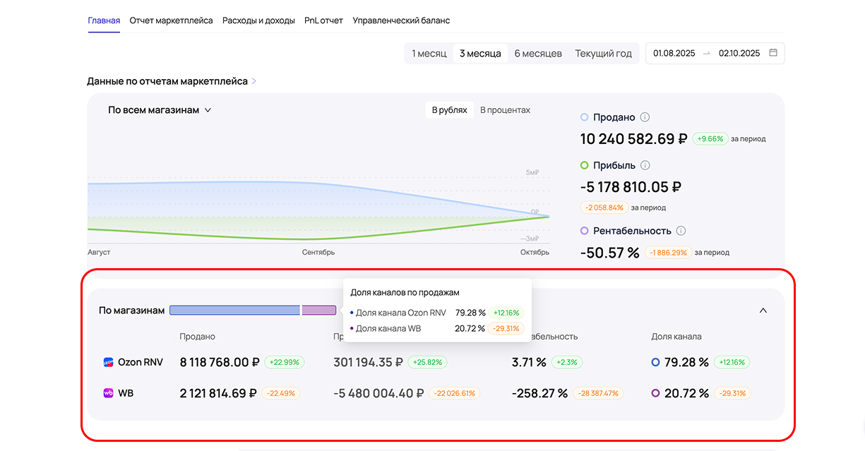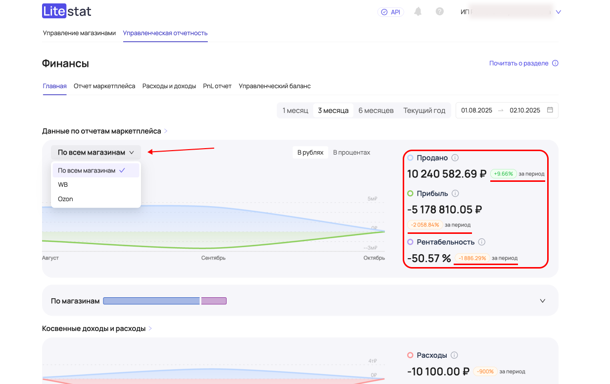 Если рентабельность просела, проанализируйте внутренние расходы МП и затраты на рекламу в разделе "Отчет маркетплейса", а также раздел «Расходы и доходы» — не выросли ли косвенные расходы.