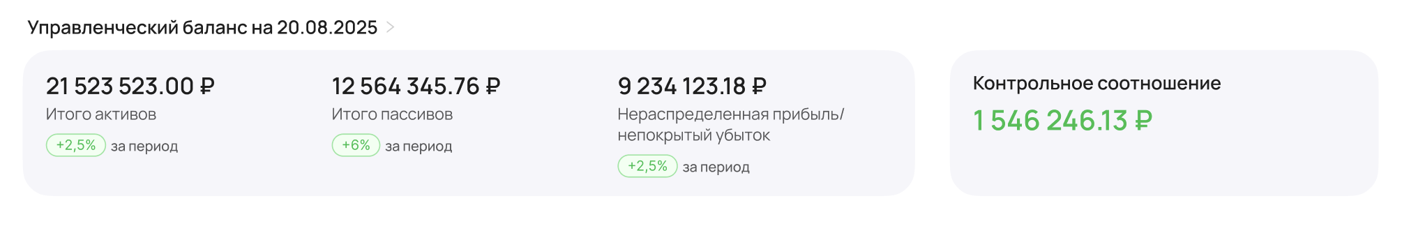 Короткий итог по активам, пассивам, нераспределённой прибыли/непокрытому убытку и контрольному соотношению. Подробности — в разделе «Управленческий баланс».