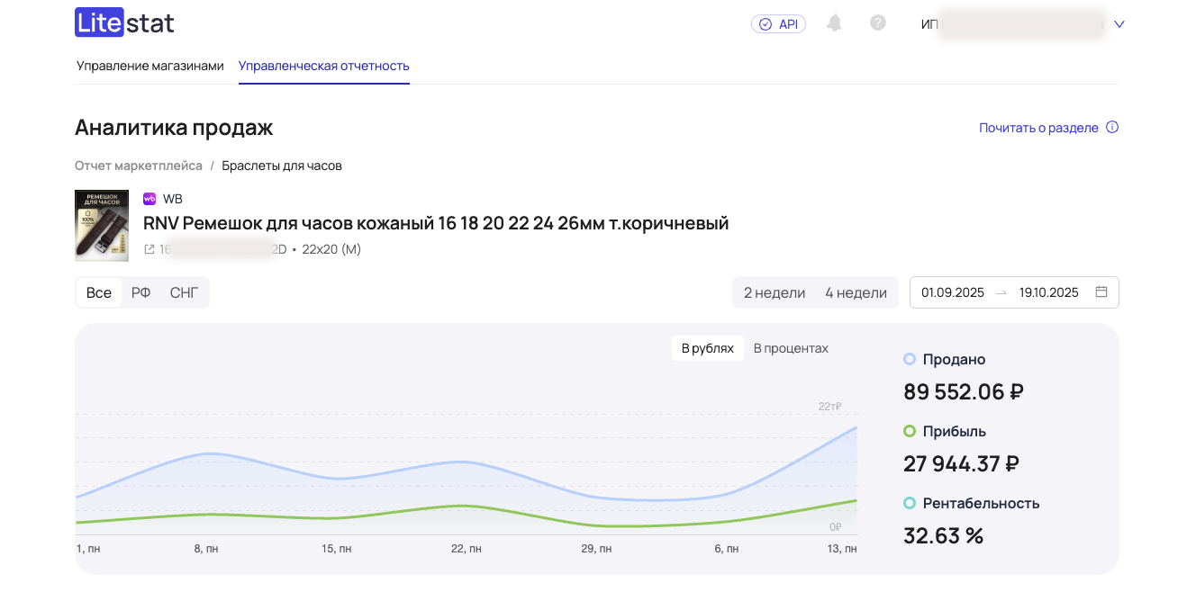 Оценка прибыльности SKU за период: видно, где теряется рентабельность (комиссии, логистика, услуги МП), и как меняется прибыль по неделям.