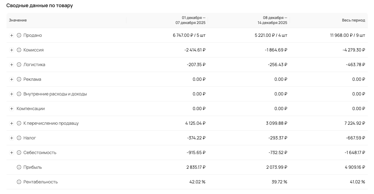 Видно, как комиссии, логистика, внутренние услуги маркетплейса, себестоимость и налоги влияют на прибыль и рентабельность товара по неделям и за весь период.