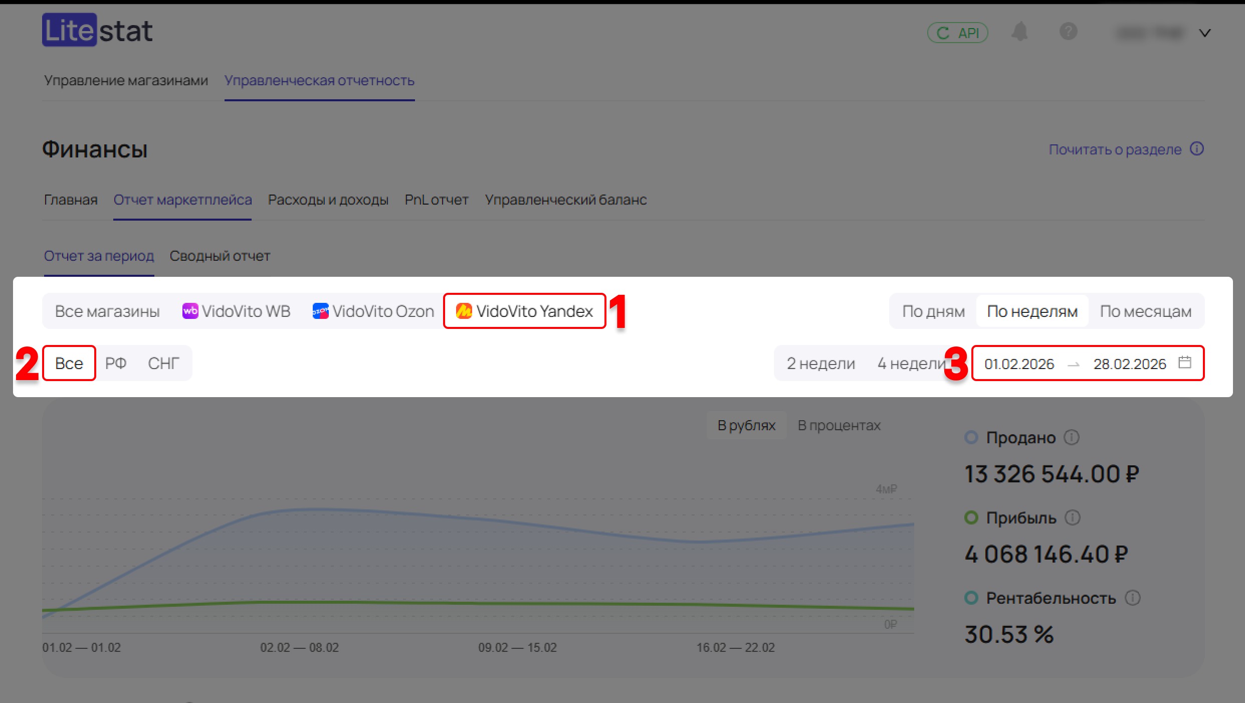 LiteStat автоматически собирает и обрабатывает данные по вашим магазинам на Яндекс Маркете. Чтобы убедиться, что сервис отображает корректные данные, вы можете сделать сверку с отчётами маркетплейса.