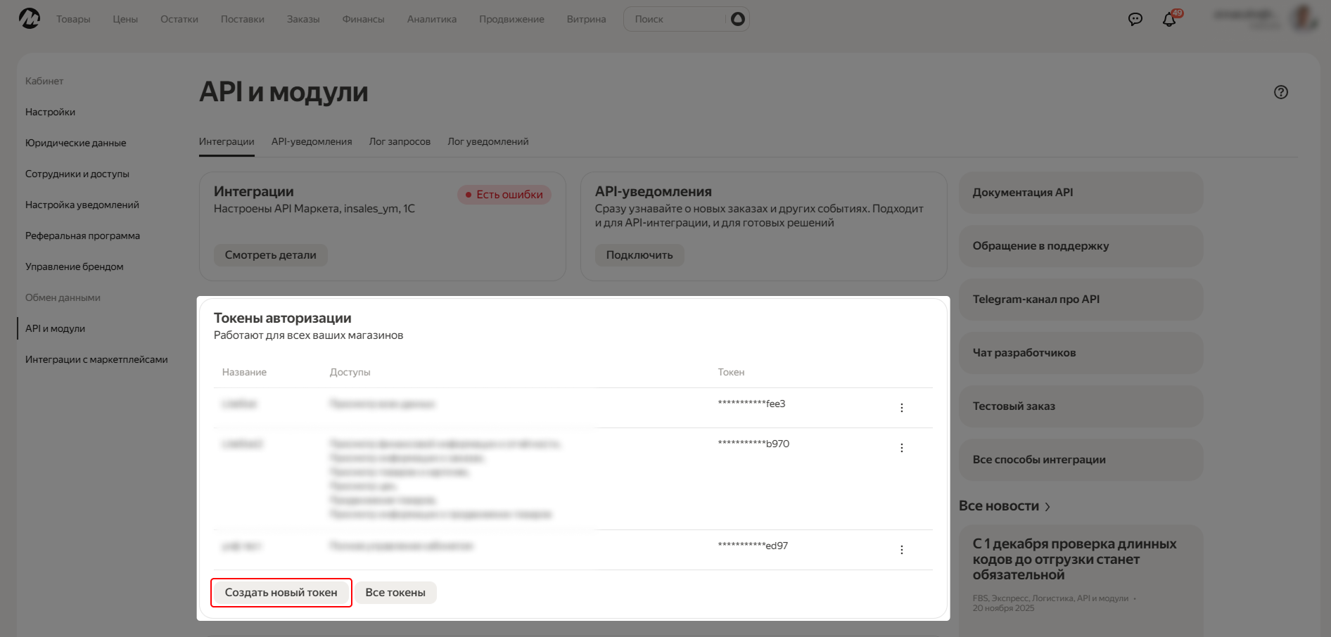 • В блоке «Токены авторизации» нажмите «Создать новый токен».